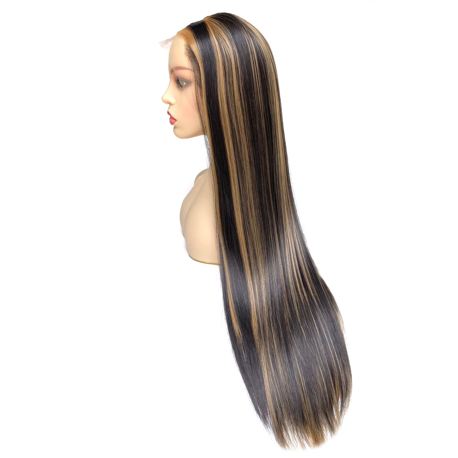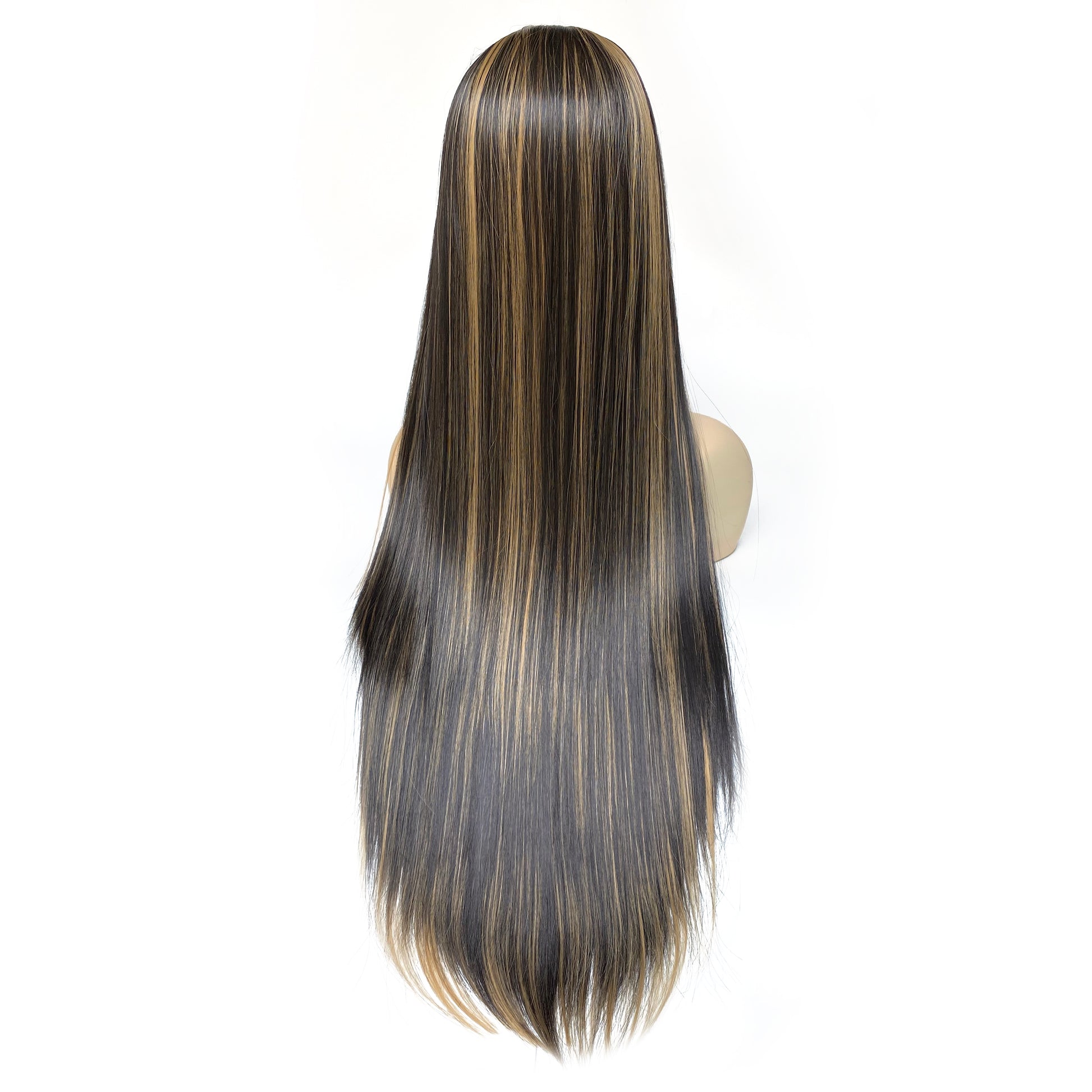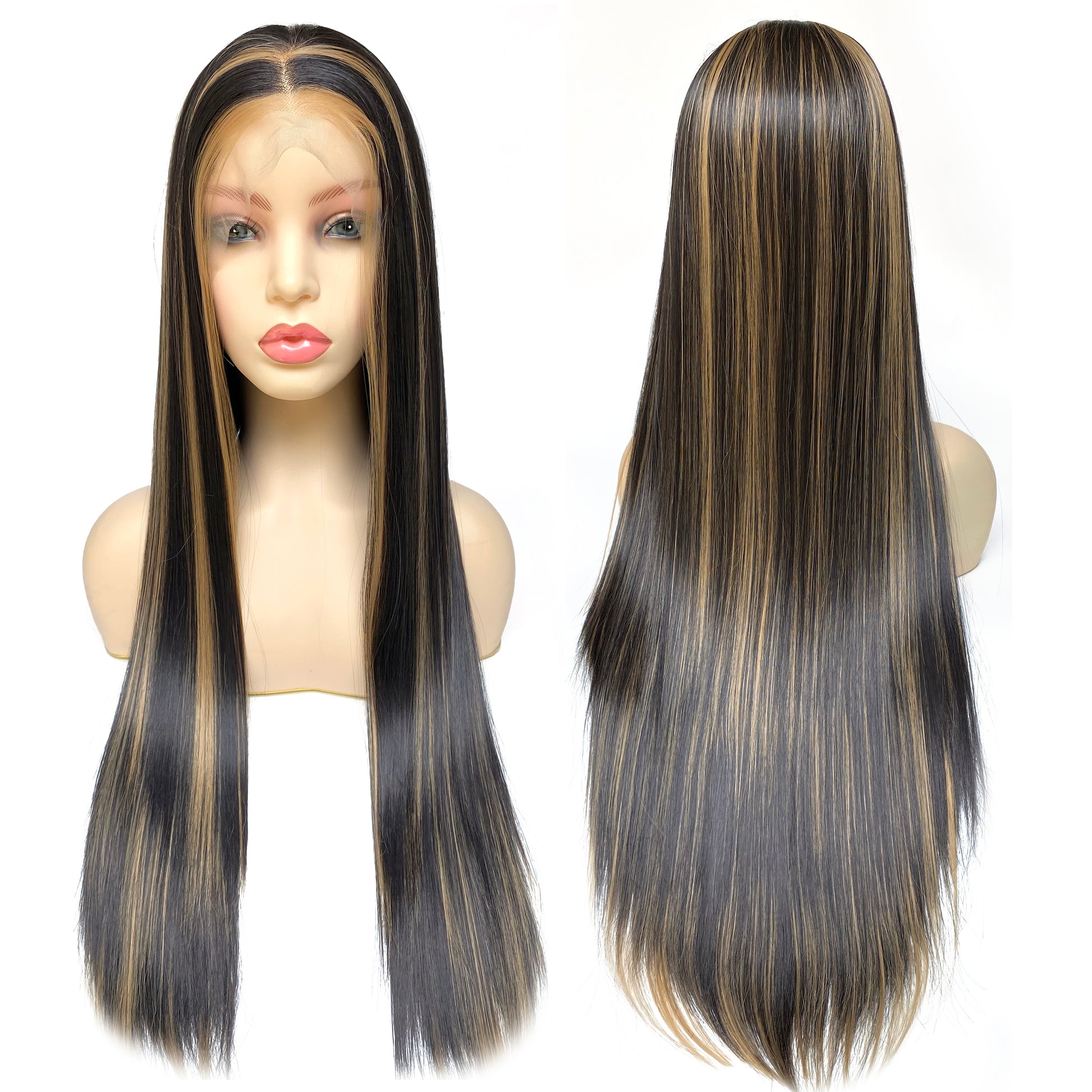 BEYOUNGER Dark Brown Highlight Color Long Straight Heat Resistant Wig 13x4 Lace Front Synthetic Wig